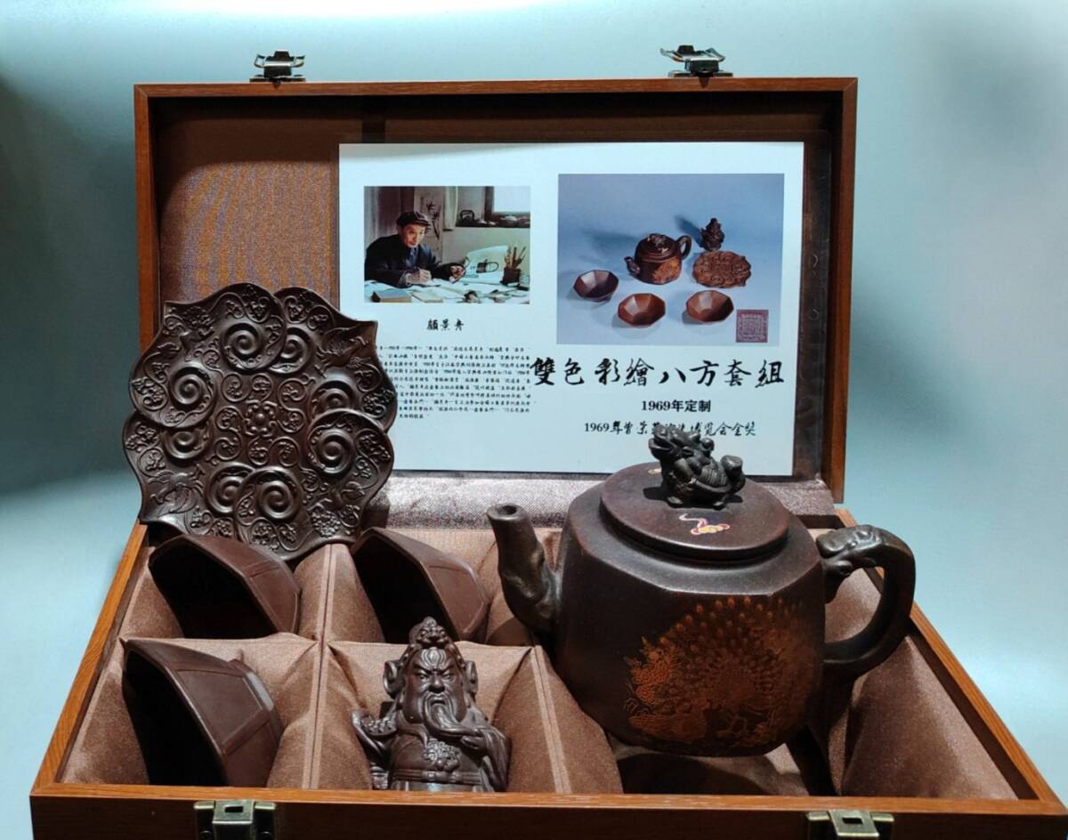 - 蔵友旧蔵出 紫砂壺 雙色彩繪八方套壺 顧景舟款 原礦古紅泥 帶茶寵 盒付 茶道品 煎茶道具 文房賞物 希少珍品 中国古玩 中国古美術品