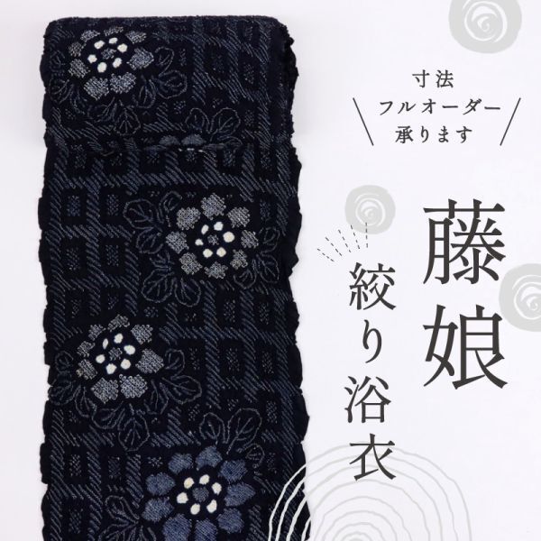 - 【手しぼり】 浴衣 反物 『藤娘』 格子に花模様 濃紺 木綿 夏着物 反25-118