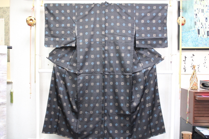 - きもの今昔8843 本場大島紬 広衿袷手縫仕立てきもの シツケ付 整然と並んだ升目にブルーと茶色の絣 身丈152㎝