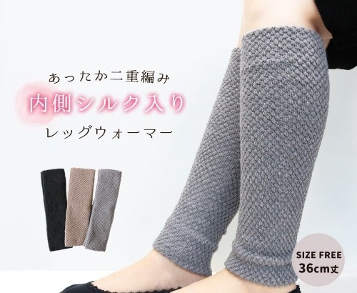 - 2重編み パイナップル編 レッグウォーマー ブラック 内側シルク入り アームカバー