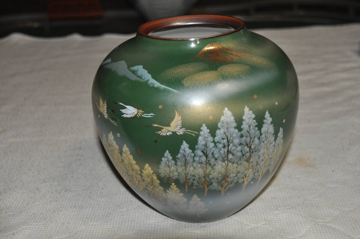 - 中古 九谷焼 花瓶 緑色 富士山&森&鶴