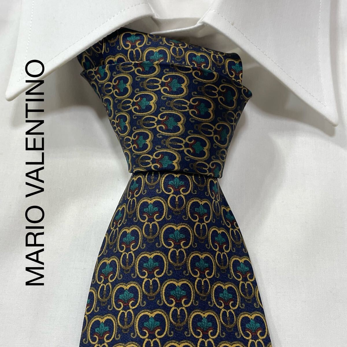 - MARIO VALENTINO マリオバレンチノ ロゴ パターン柄 シルク ネクタイ イタリア製 ネイビー TG2718