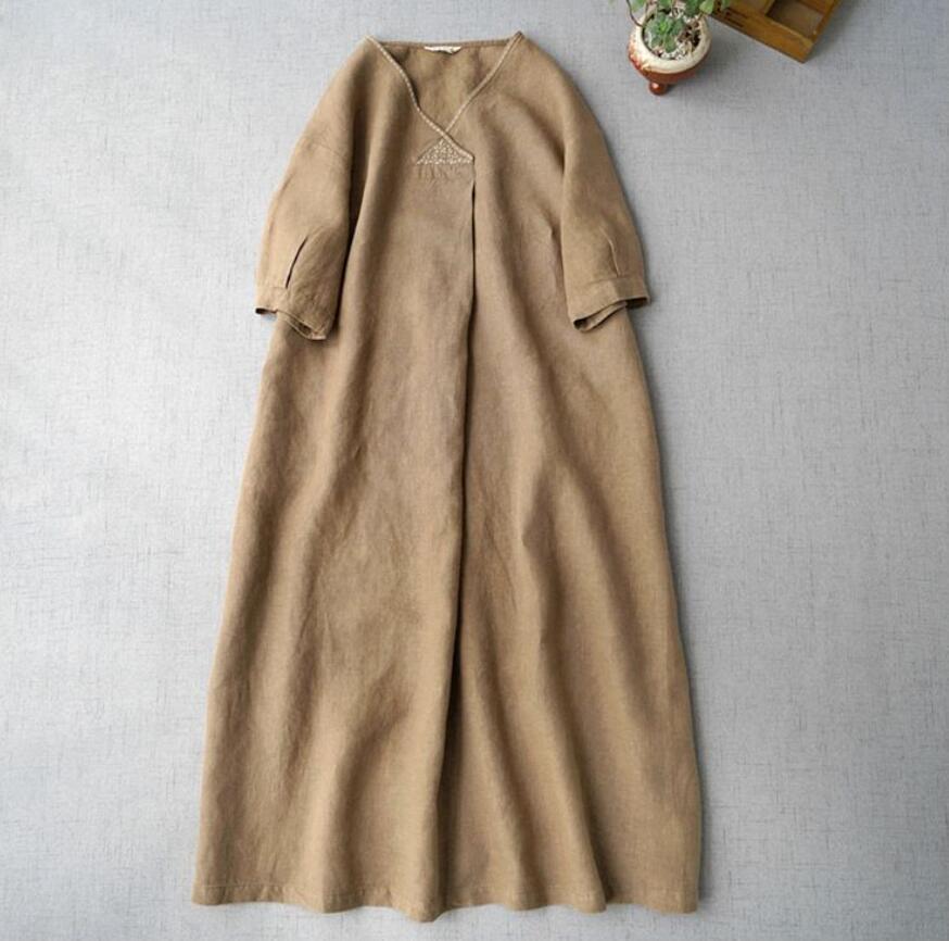- 夏新品*ゆったり ワンピース Vネック 手縫い Aライン ワンピース 亜麻100%リネン ワンピース 通気性 肌触り抜群 半袖 ロングワンピース*M