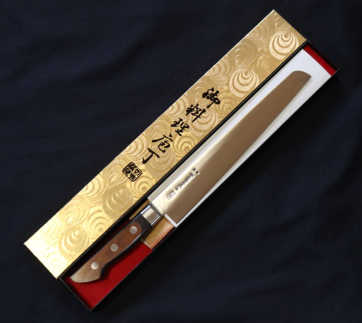 - 刃長235mm 郷右馬充義弘 ツバ付 先丸筋引包丁 本職用 刺身包丁