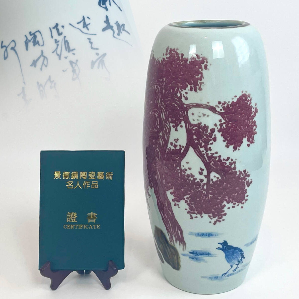 > 景徳鎮 章兆麟 釉裏紅 辰砂青花壺 漢詩 花瓶 高さ:39cm 名人作品證書付き 中国美術 古玩 花入 作家物 検) 秦錫麟 邱含