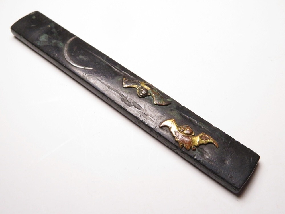 - 【11156】刀装具 江戸~明治 赤銅地 在銘 三日月にコウモリ 小柄(初品・買取品)