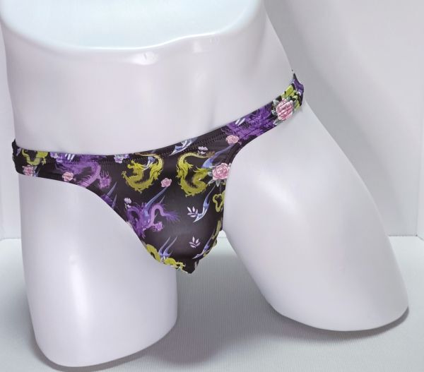 - メンズ ハーフシーム Tバック ビキニ ブラックドラゴン系柄 日本Mサイズ