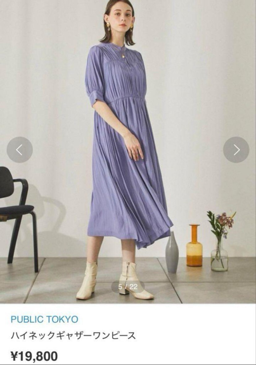> 美品PUBLIC TOKYO・パブリックトウキョウ☆ハイネックギャザーワンピース 半袖ワンピース ワンピース 半袖 FREE ブルー