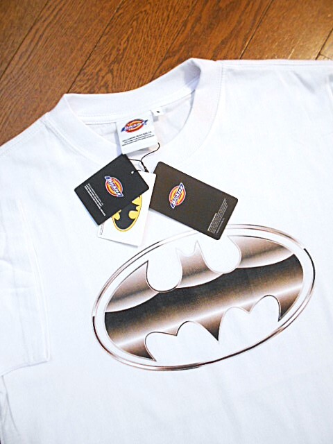 > Dickies・ディッキーズxバットマン☆コットン100%♪ビッグプリントxロゴワッペン 半袖Tシャツ 白 大き目S 未使用品 定価 \5.500