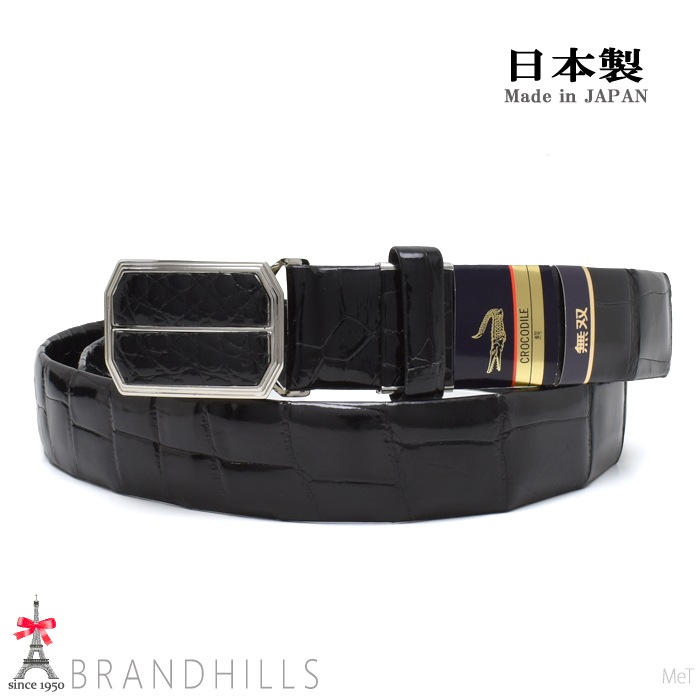 - クロコダイル ベルト メンズ 本無双 ブラック シャイニング加工 紳士用 黒 幅35ミリ スライド式バックル 日本製 新品