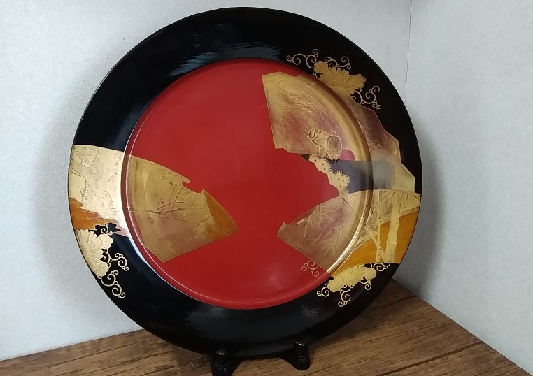 - ☆r☆【骨董・木工工芸・漆芸】漆器 飾り大皿 木製 漆塗り 金彩蒔絵 松竹梅・鶴図 直径 53㎝/ 時代物 古民具
