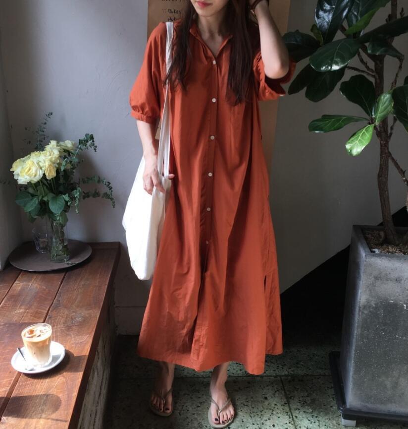 - 人気推薦 /レディース シャツワンピース ロングシャツ 前開きワンピース 無地 半袖 ロングシャツワンピース ゆったり 着やせ/オレンジ
