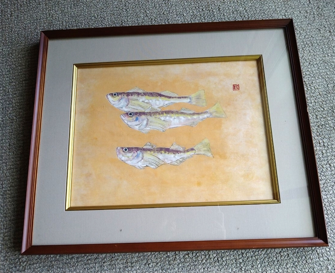 - 【貴重 お買得】日本画『ハタハタ』岩絵具 落款有り ガラス額入り 外箱付き 静物画 魚 真作か模写か不明 肉筆