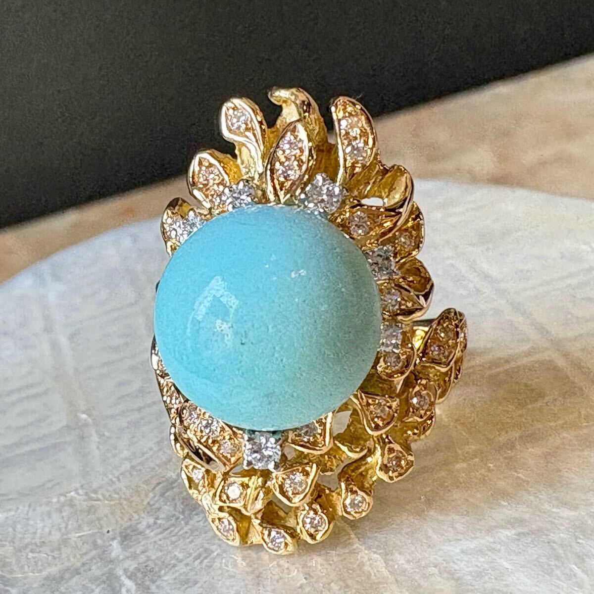 > <K18/Pt900>12mm トルコ石リング 0.38ctダイヤ 9.1g 11号 ターコイズ ソーティングメモ