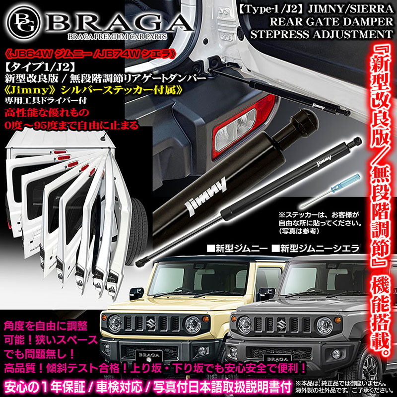 > 新型2025モデル/タイプ1/J2 Jimnyステッカー付/JB64Wジムニー車・JB74Wシエラ車用/リアゲートダンパー/無段階調整/車検対応/ブラガ