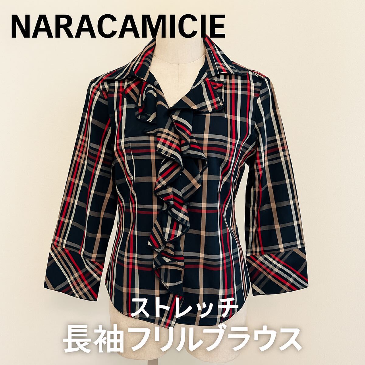 > NARACAMICIE ナラカミーチェ チェック柄 長袖フリルブラウス ストレッチ素材 ネイビー系 IIサイズ ルーマニア製 M