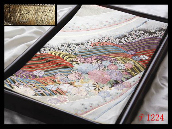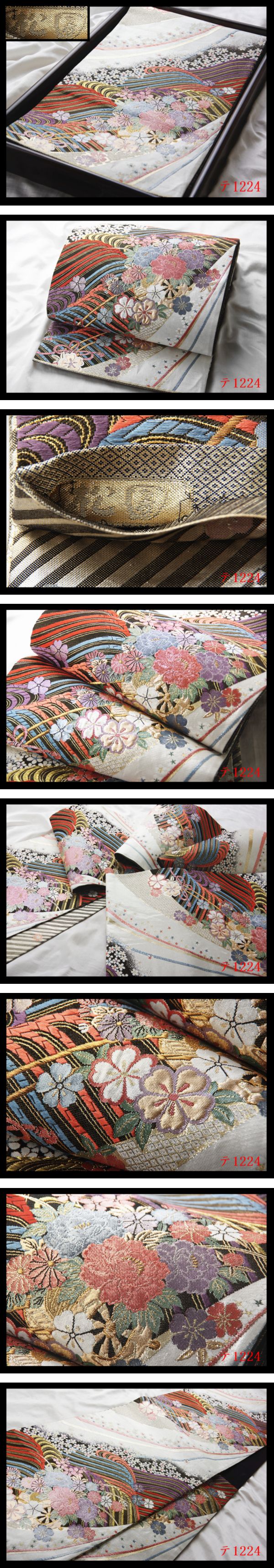 > 蔵【テ1224】西陣逸品 振袖可 松園 波頭草花紋 シルバー色地 正絹純金糸六通高級美術袋帯 ◇検◇簪着物名古屋帯和装小物帯締め