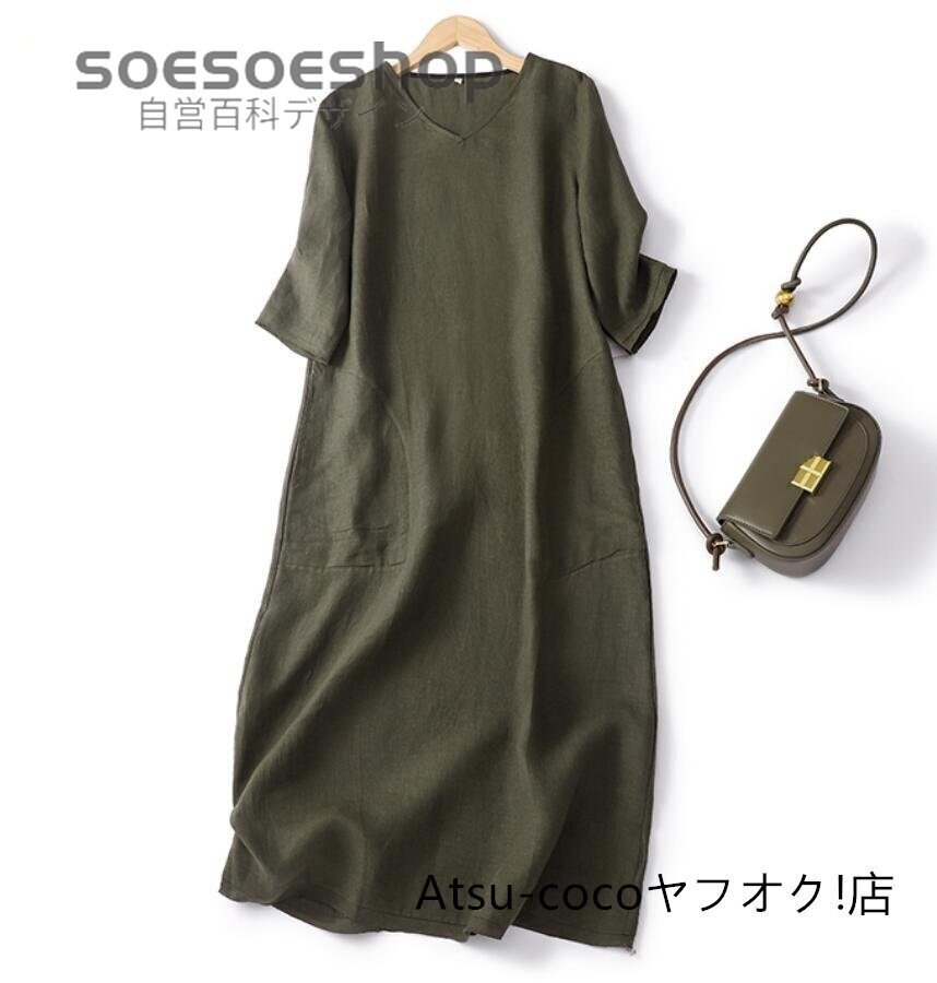 - カジュアル 無地 ロングワンピース リネン綿麻 大きい おしゃれ 大人 半袖 マキシ丈 ワンピース ★Lサイズ