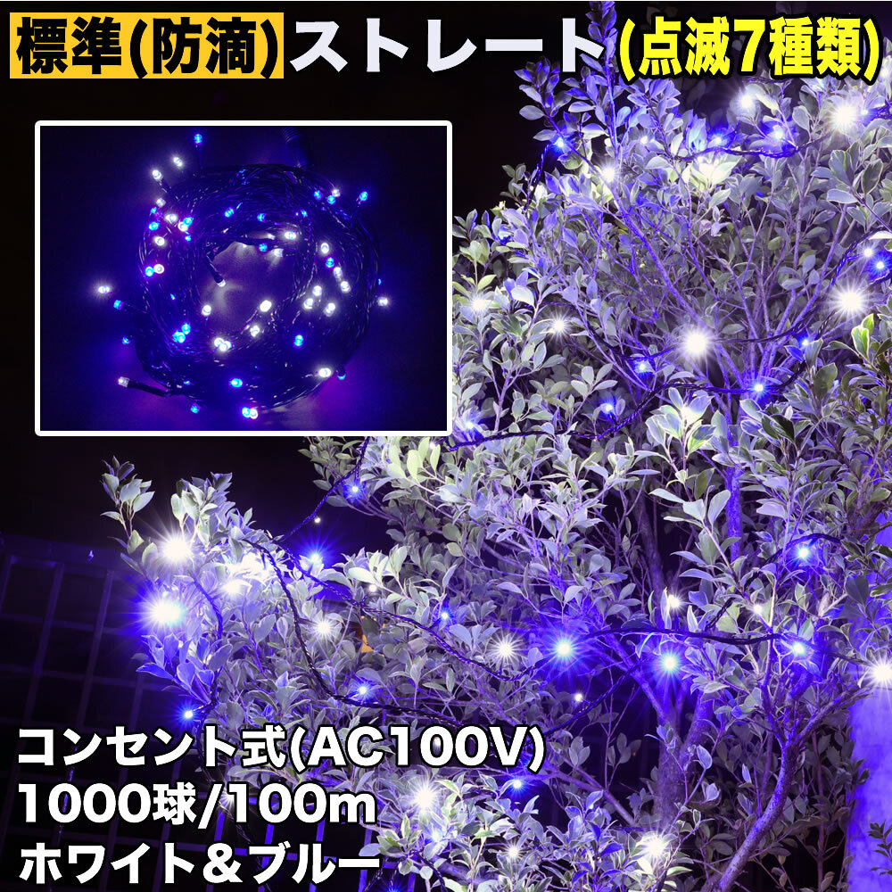 > クリスマス 防滴 イルミネーション ストレート ライト 電飾 LED 1000球 100m 2色 白 ・ ブルー 7種類点滅 Aコントローラセット