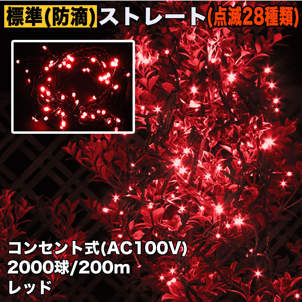 > クリスマス 防滴 イルミネーション ストレート ライト 電飾 LED 2000球 200m レッド 赤 28種点滅 Bコントローラセット