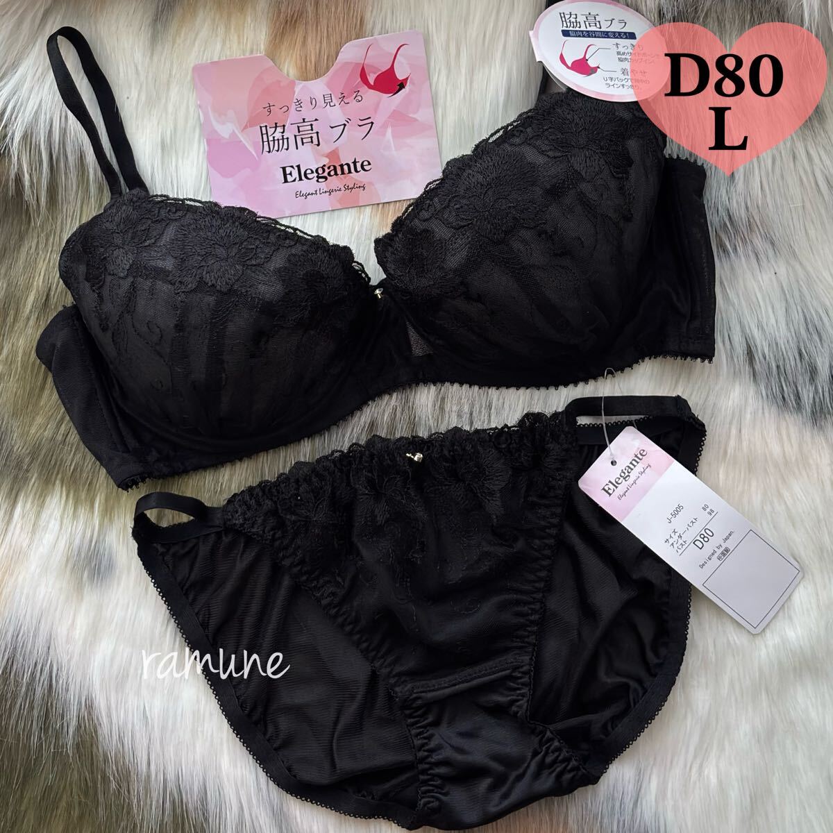 - 【D80-L ブラック 上下】新品 ブラ&ショーツ ブラジャーショーツセット パッド付き 脇高 かわいいパンティ 花柄刺しゅう 寄せ上げ Dカップ