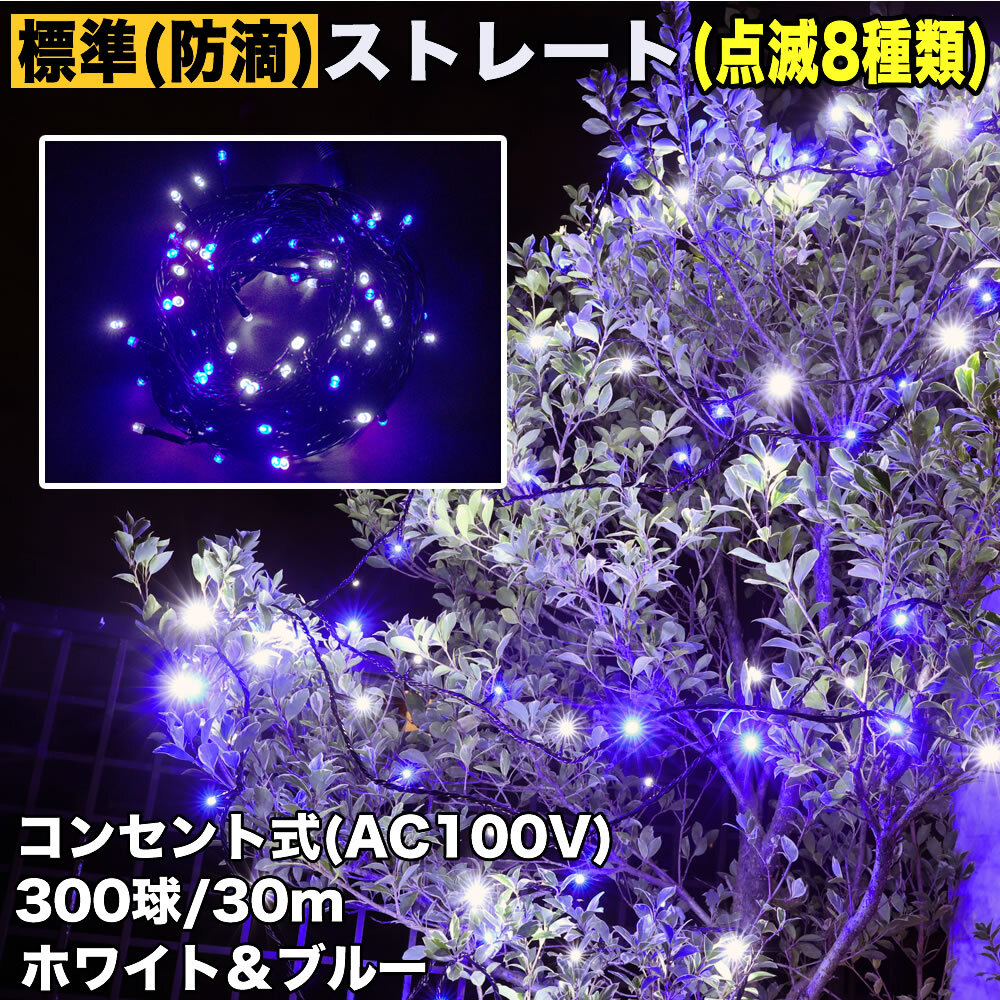 > クリスマス 防滴 イルミネーション ストレート ライト 電飾 LED 300球 30m 2色 白 ・ ブルー 8種類点滅 Aコントローラセット