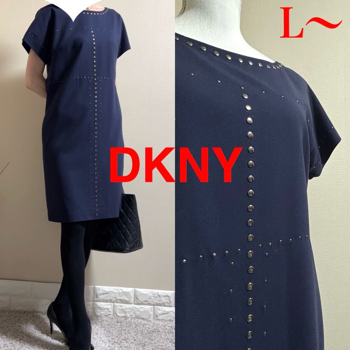 > DKNY ストレッチウール シルバースタッズ ワンピース L〜 紺 七五三 入学式 卒業式 入園式 卒園式 通勤 オフィス 式典