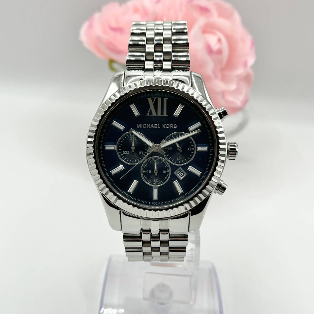- 《訳あり》MICHAEL KORS★マイケルコース★クォーツ 腕時計★クロノグラフ★カレンダー★デイデイト★メンズ★シルバー×ネイビー
