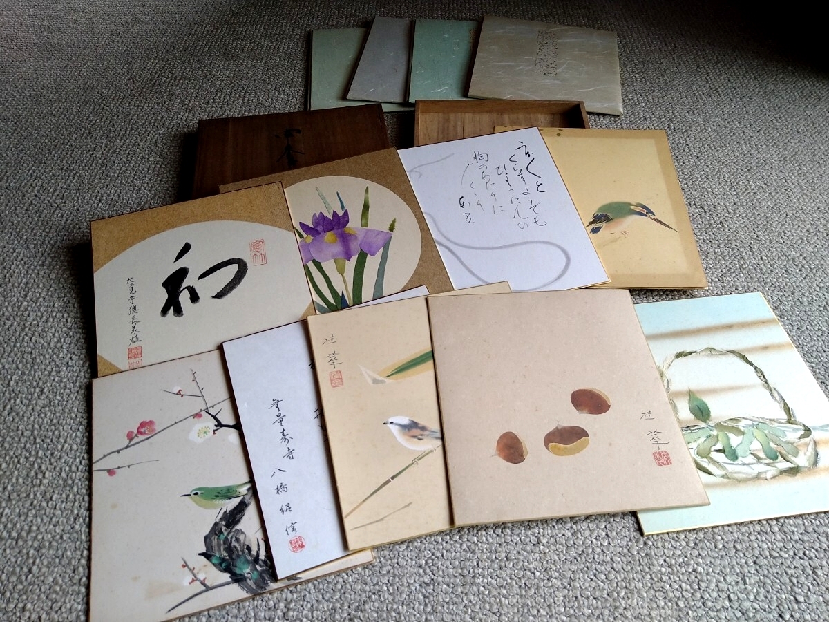 - 【貴重 お買得】色紙14作品セット 色紙用掛軸付き 木箱、タトウ入り 紙本、絹本に花鳥画、書、押絵など 桂華 明然 大覚寺総長 ほか