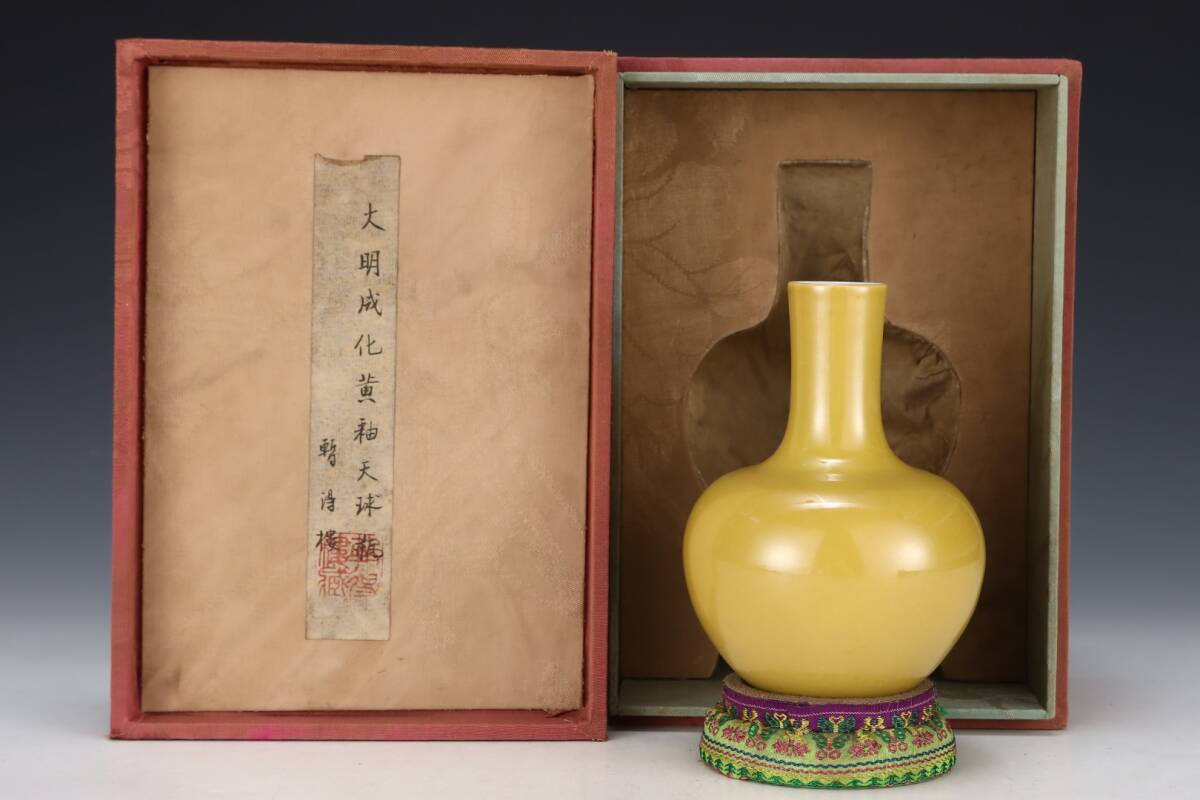 > 多宝閣 ■207046 人間国宝 中国磁器【明成華黄釉天球花瓶】工芸品 施釉陶 陶芸 置物 收藏品 孤品