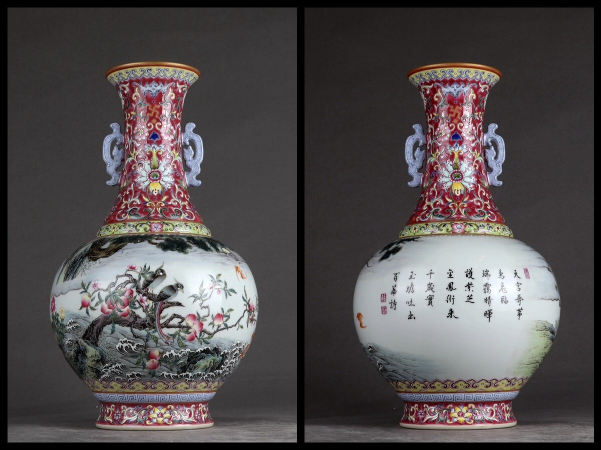 > 「清 乾隆年製 陶磁器 臙脂紅地粉彩福山壽海 詩文双耳瓶」染付 置物 擺件 古賞物 中国古美術 旧蔵出