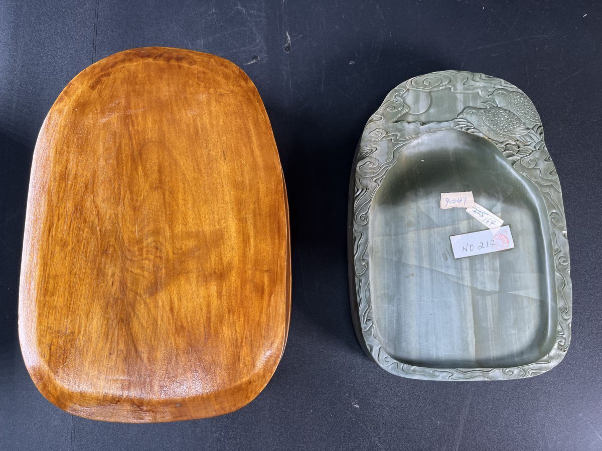 - 【松花石硯 趙樸初 鳥彫刻 4044g 木箱付】端渓硯 老坑 文房四宝 中国美術 中国古玩 古硯 唐硯 中国硯 硯(14321)