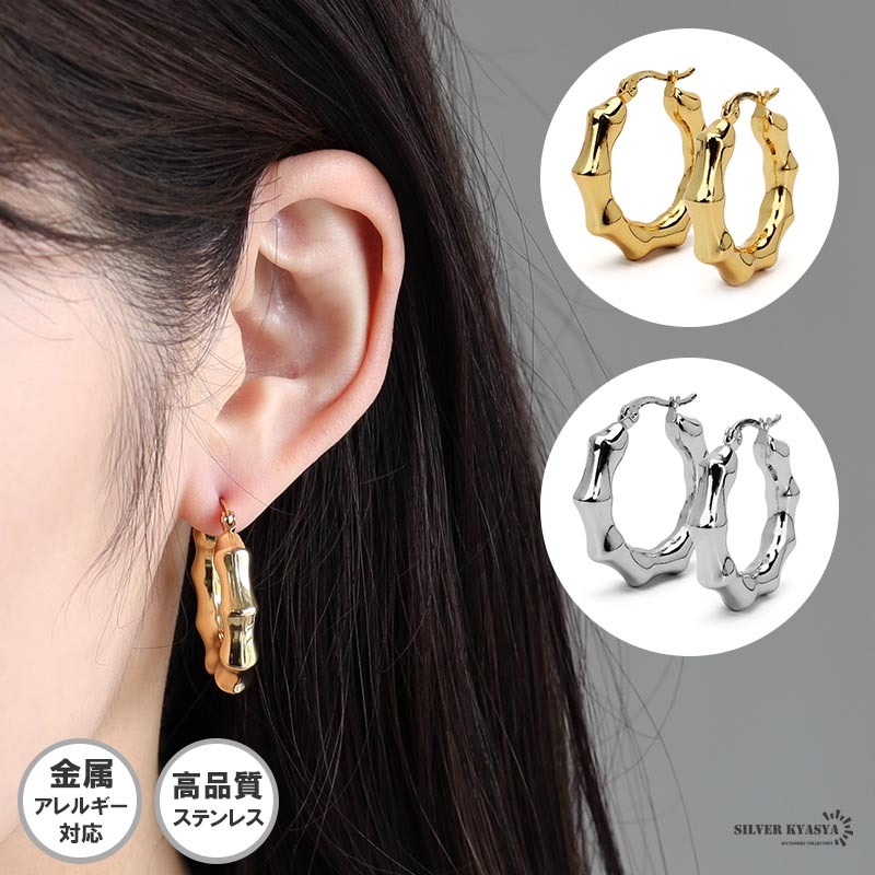 - (シルバー) ステンレス 竹節ピアス ワイドピアス 大ぶりピアス 両耳2点セット フープピアス シルバー 金属アレルギー対応