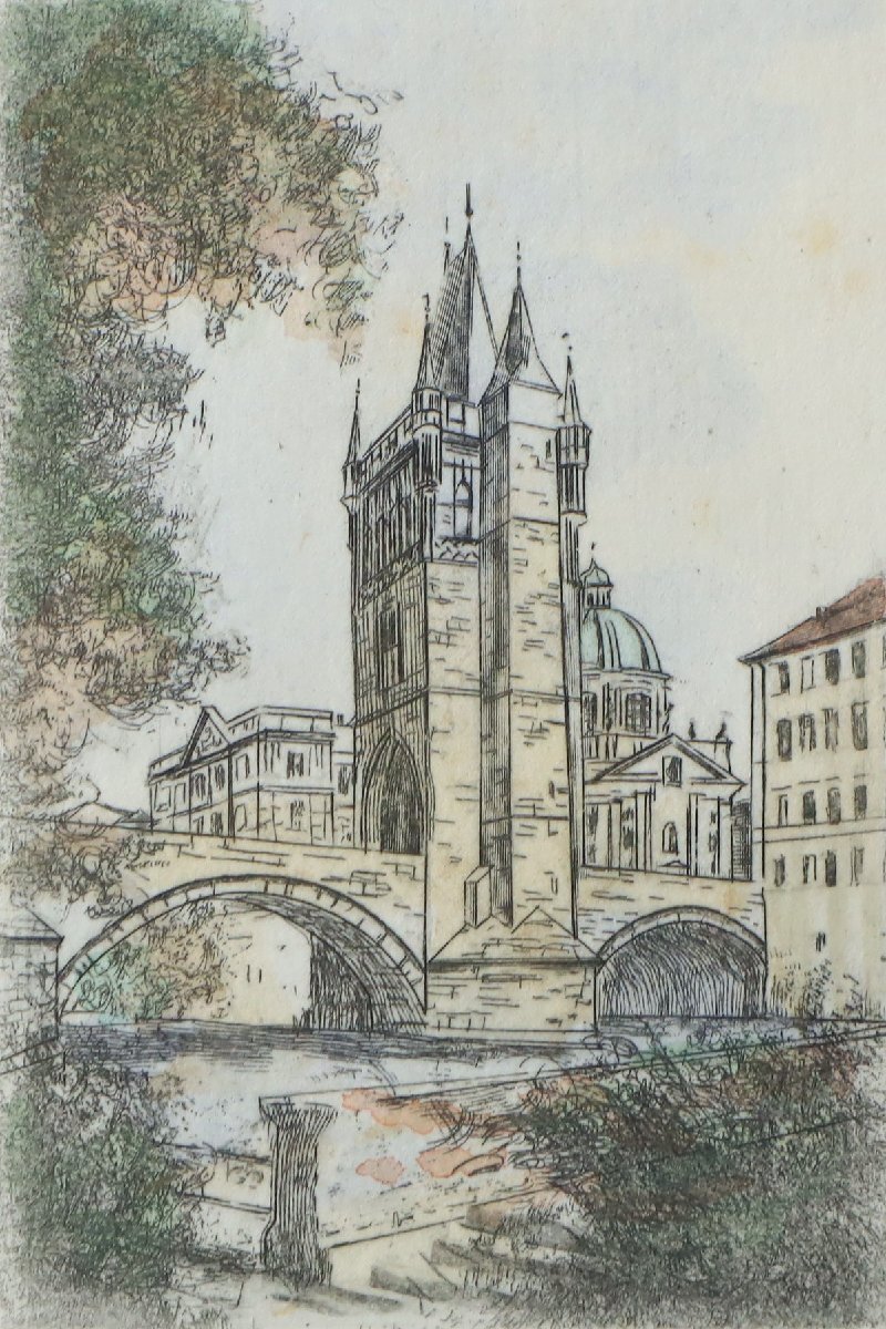 ・エッチング「ヨーロッパ風景」11/210 銅版画 大型額装品 小判 作者サイン有り