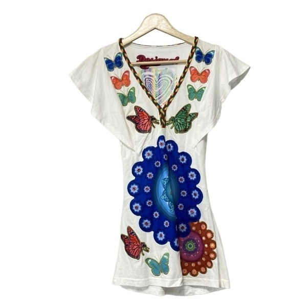 - デシグアル Desigual 半袖カットソー サイズS - 白×ブルー×マルチ レディース 刺繍/スパンコール/バタフライ(蝶) トップス