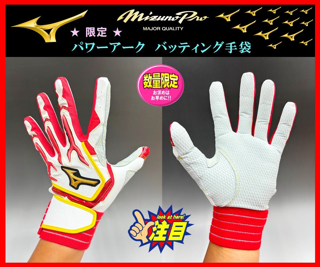 - ◆送料&刺繍無料◆ 25cm ミズノプロ バッティング 手袋 ダブルベルト 1EJEA55701 白×赤×黄 両手組 パワーアーク グラブ 天然皮革 限定