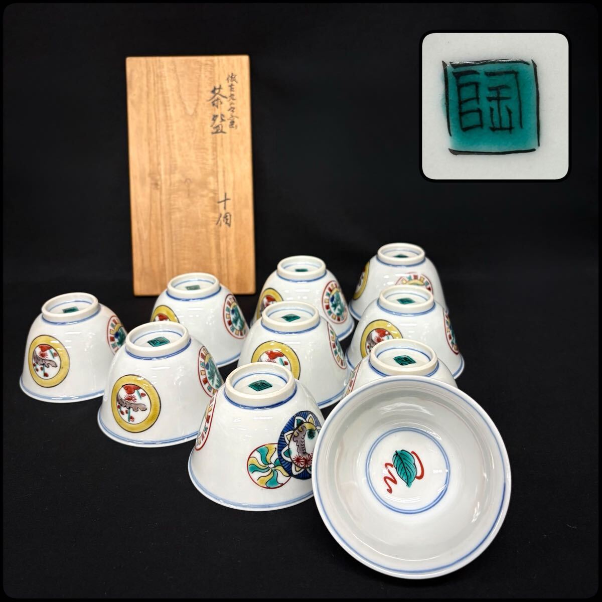 - 未使用 九谷焼 陶源製 倣古九谷 窓絵 汲出茶碗 10客揃 共箱 煎茶器 煎茶碗 湯呑 美品 (08157Y