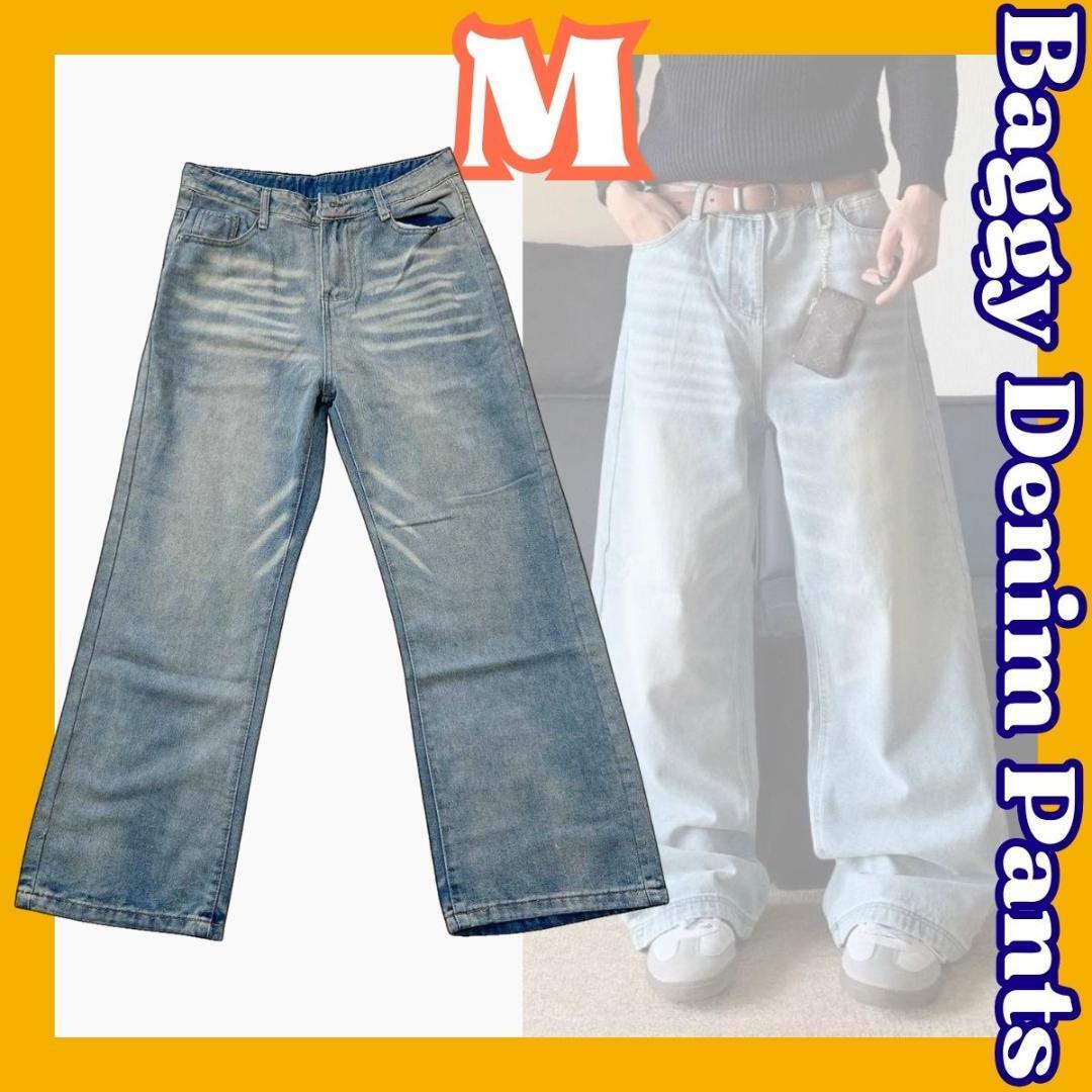 - バギーデニムパンツ M バギーパンツ ワイド ハイウエスト ユーズドテクスチャ