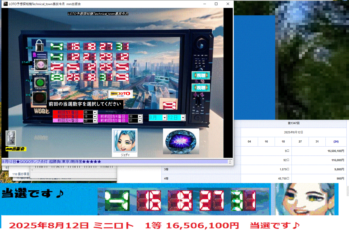 - 新作ロト予想ソフト[LOTO予想探知機Technical_town嘉辰令月] 2025年8月12日 ミニロト 1等 16,506,100円 当選です♪