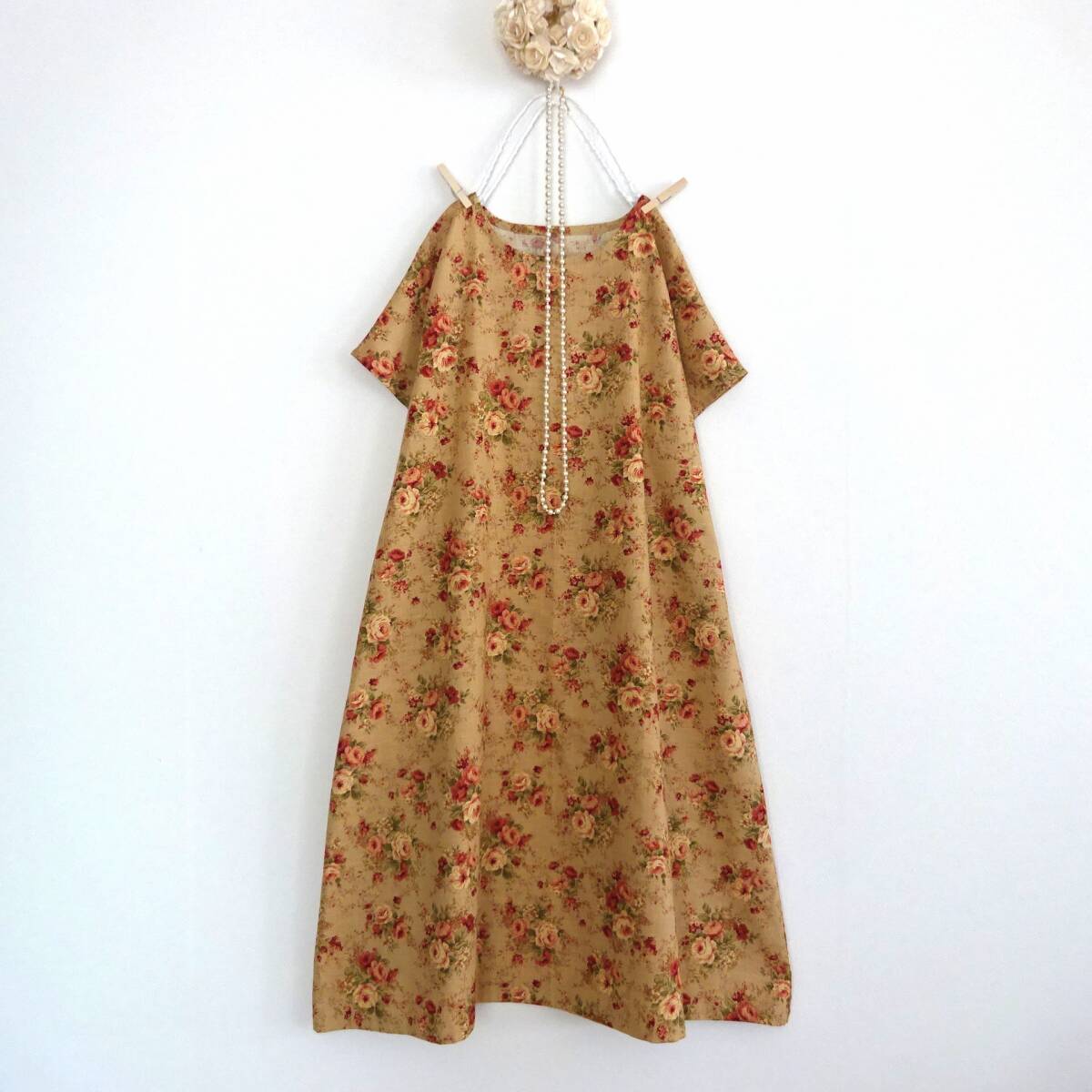 - 着丈オーダー◆コットンリネンのアンティークローズAラインワンピース◆綿麻 花柄 薔薇 ハンドメイドop フリーサイズ