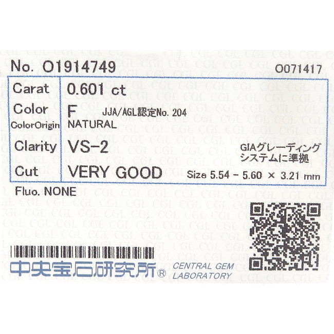 > ダイヤモンド ルース 0.601ct F VS-2 VERYGOOD 5.54-5.60mm×3.21mm 中央宝石 ソーティング付き 裸石 宝石【中古】/29306/10013084
