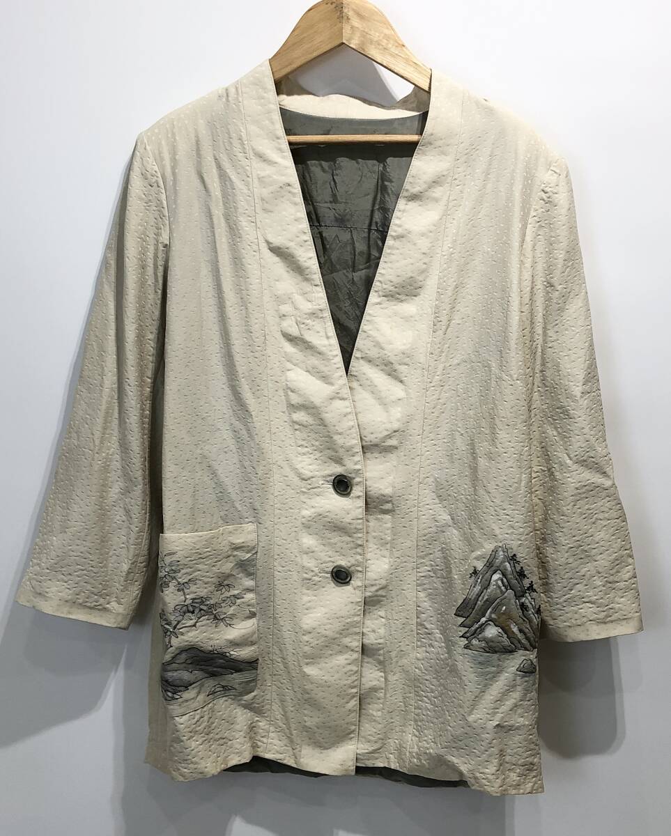 - 【古着】 着物 リメイク ノーカラー ジャケット 羽織 和服 和柄 アイボリー ハンドメイド■0814L②