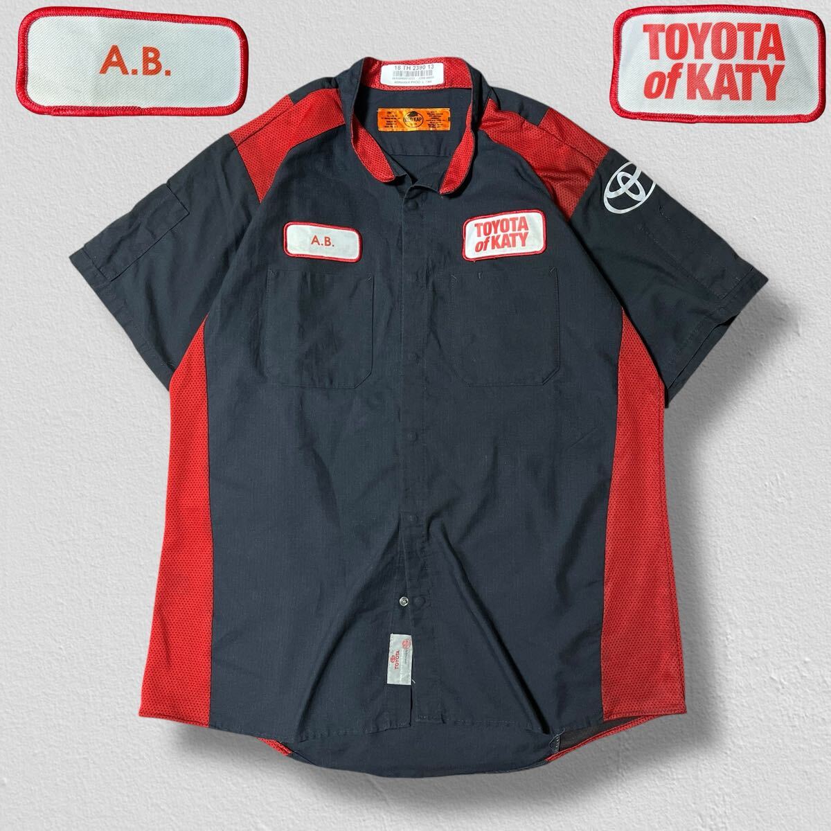 - RED KAP 半袖ワークシャツ ワッペン TOYOTA of KATY A.B. ブラック×レッド L ●洗濯プレス済●ネコポス可● シャツ 黒 古着/542