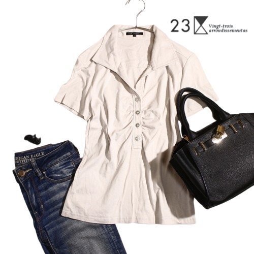 - 美品 23区 株) オンワード樫山 夏 ギャザー 襟 半袖 スキッパー カットソー 11号 40 ライトベージュ ライトグレー ミセス オフィス 綺麗め