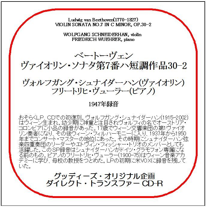 - ベートーヴェン:ヴァイオリン・ソナタ第7番/ヴォルフガング・シュナイダーハン/送料無料/ダイレクト・トランスファー CD-R