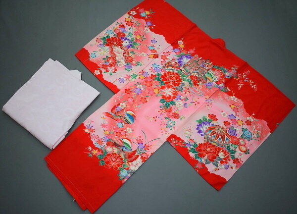 - A50-9【凛々】即決 中古品 正絹 お宮参り 女児 初着 祝着 赤 ピンク 御所車 花 長襦袢付