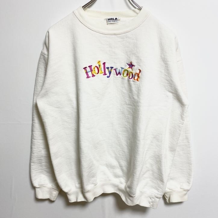 - 古着 used 90s HRLA 長袖ロゴ刺繍スウェット トレーナー クルーネック Hollywood 白 ヴィンテージ Sサイズ