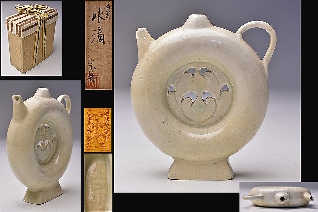 > 帯谷宗英 ★ 白瓷 水滴 ★ 共箱 共布 ★ 口欠 (注ぎ口に欠け) あります ★ 笹文 ★ おびや陶房 ★ 師匠:鹿児島寿 ★ 繊細なつくり ★