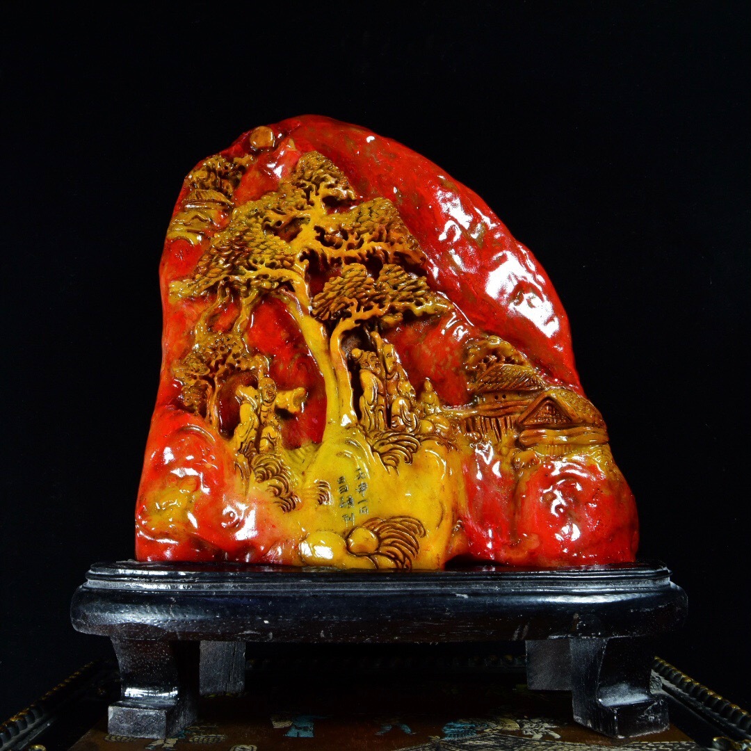 - 蔵友旧蔵出 寿山石 鶏血石 田黄凍石 細密彫 深山訪友 擺件 貴重品 稀少物品 置物 賞物 中国時代美術品