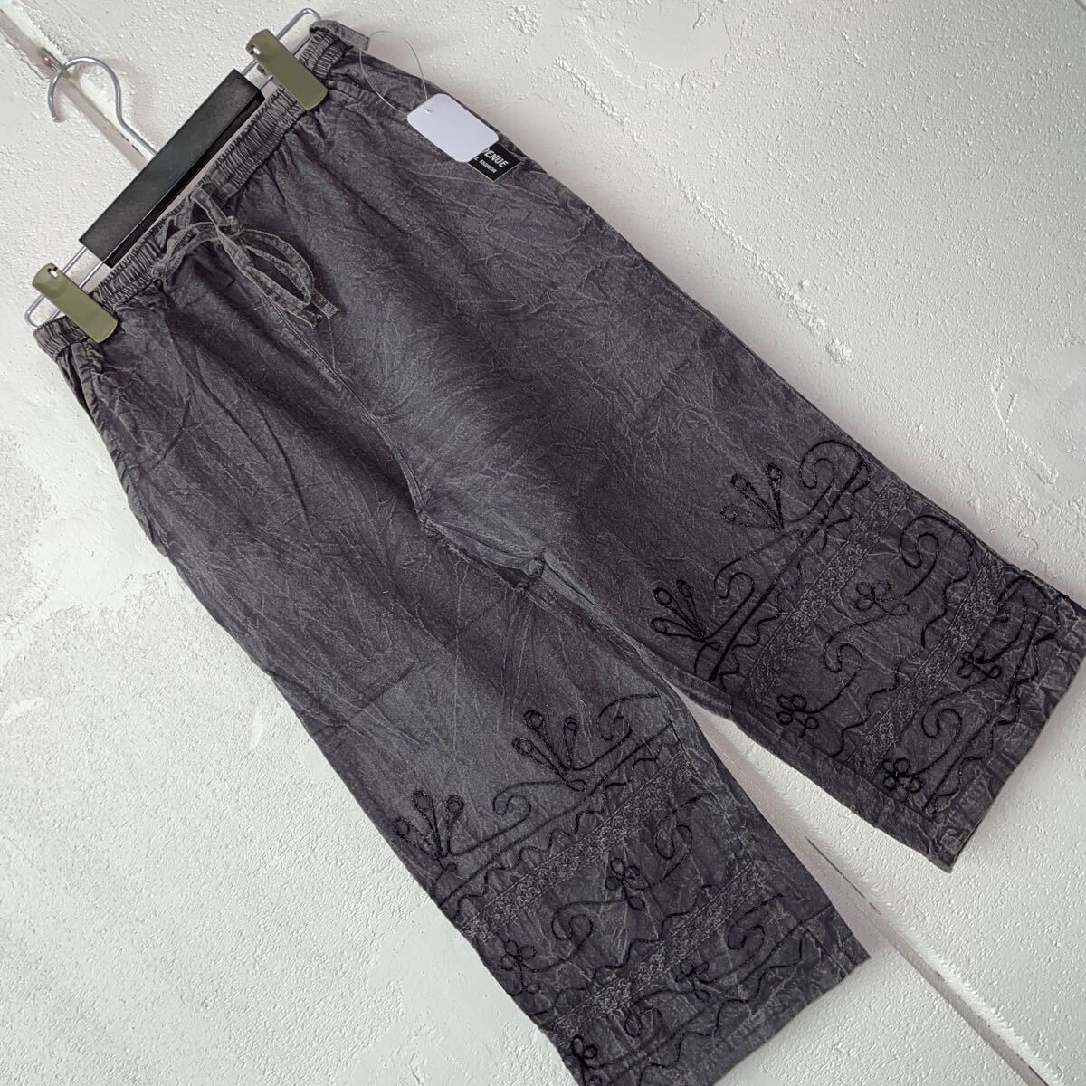 - インド綿100%裾刺繍洗い加工七部丈パンツ パープルグレー